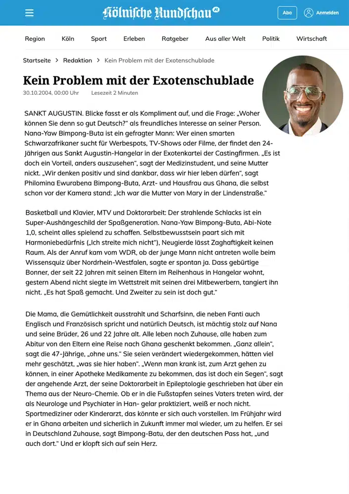 Kaum zu überhören: Herzensdoc Nana ist Rheinländer mit Leib und Seele. Nach dem Medizinstudium und der Promotion in seiner Geburtsstadt Bonn arbeitet er als Assistenzarzt und Facharzt in Bern und Düsseldorf. Seit 2018 ist er Oberarzt für Kardiologie. Er engagiert sich seit über zwei Jahrzehnten für soziale Projekte in Ghana und Guatemala und lebt mit seiner Familie in Wuppertal.