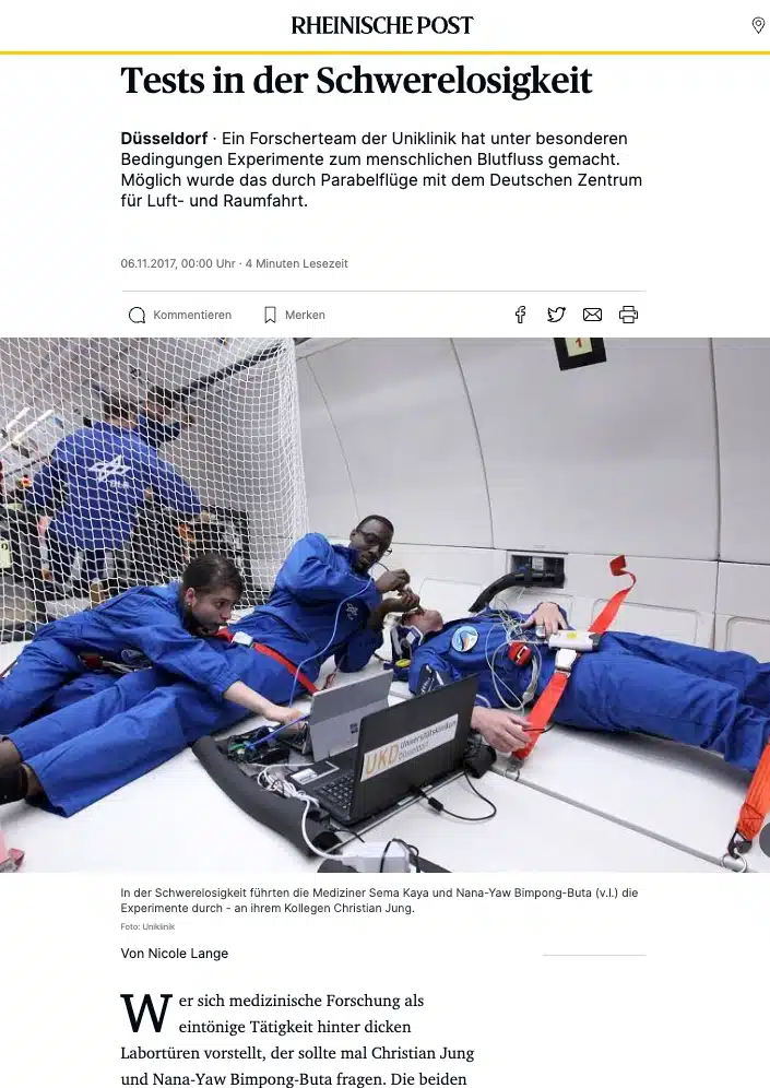 Im Rahmen eines Forschungsprojektes der Deutschen Raumfahrtagentur (DLR) startete Herzensdoc Nana mit seinem Team von der Uniklinik Düsseldorf in zwei aufeinanderfolgenden mehrwöchigen Flugkampagnen (2017 sowie 2018) mit einem Airbus im französischen Bordeaux. Zusammen mit anderen internationalen Forschern sowie DLR-Astronauten absolvierte er als einziges Besatzungsmitglied insgesamt 180 Parabelflüge an sechs Flugtagen. Dabei führte sein Team medizinische Experimente in der Schwerelosigkeit zu seinem Forschungsthema, der sublingualen Mikrozirkulation, durch.
